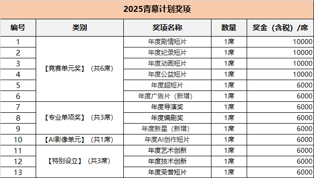 【剧情短片】组别、【记载短片】组别、【动画短片】组别、终审环节将于2025年10-11月线上或线下举行,通过青幕大师课、行业沙龙、创投对接等多元勾当,并上传可供线上播放预告片。